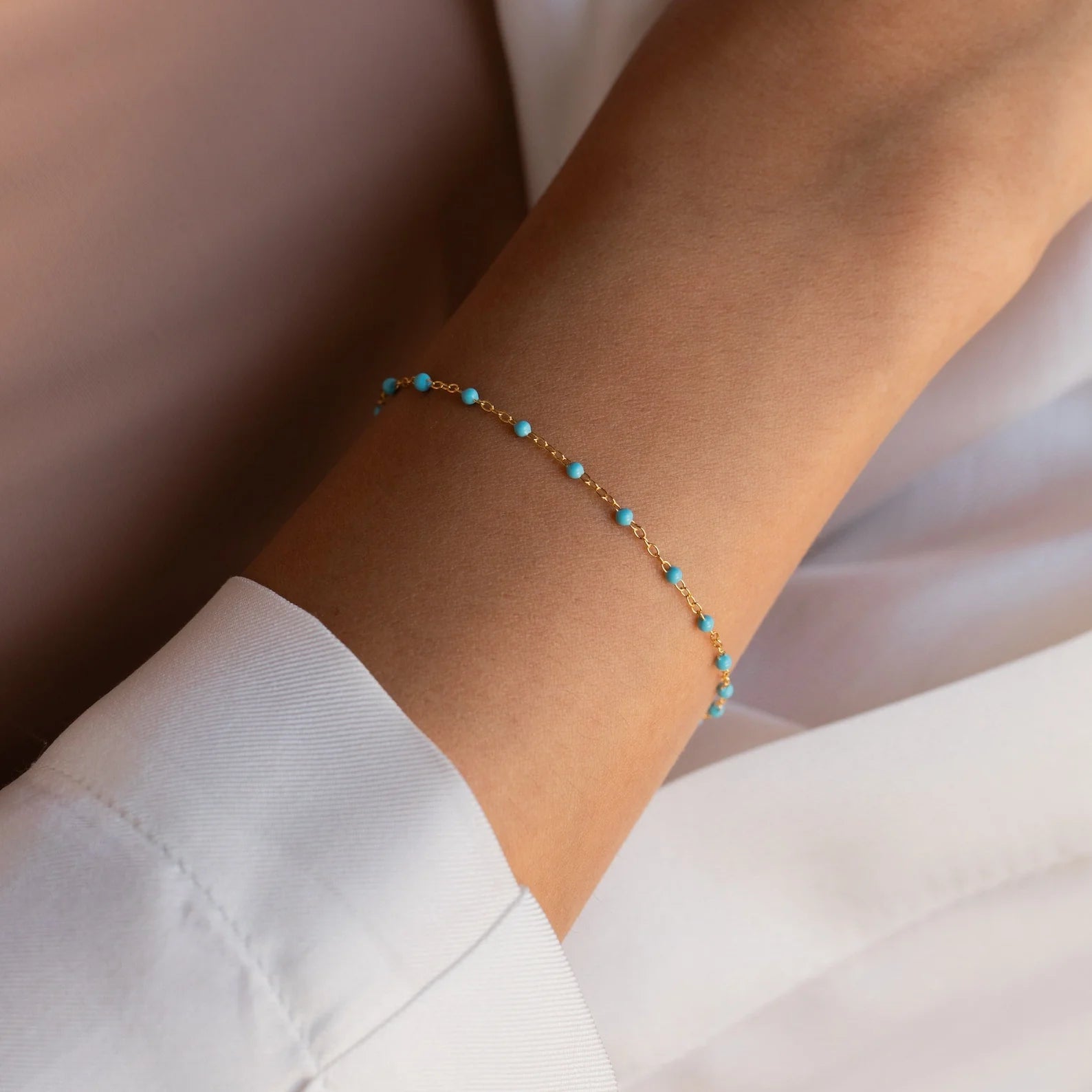 Verleihe Deinem Look eine extra Portion Glamour mit unserem türkisfarbene Armband. Handgefertigt aus glitzernden türkisfarbenen Perlen, ist es der perfekte Weg, Deinen Stil zu betonen. Überzeugen Sie alle mit einem atemberaubenden und unvergesslichen Aussehen!